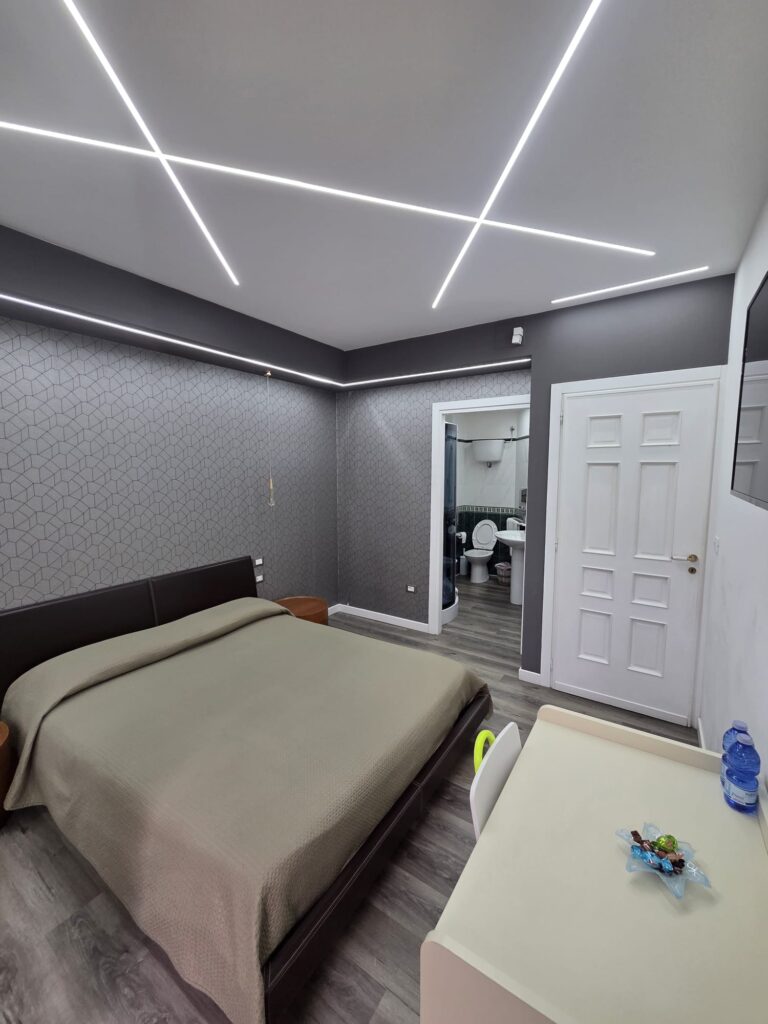 Camere rinnovate per chi ama uno stile essenziale e tecnologico. ​Illuminazione: Caratterizzate da un elegante sistema di luci a LED integrate a soffitto che crea un’atmosfera unica.